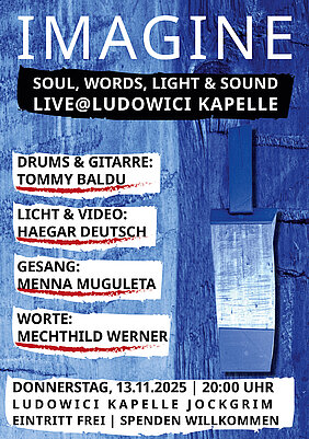 Die Kunst von Franz Bernhard, die das Erscheinungsbild der Kapelle prägt, bildet den Rahmen. In atmosphärisches Licht von Haegar Deutsch getaucht, entsteht eine Bühne, auf der die Soulstimme von Menna Mulugeta, Percussion und Gitarre von Tommy Baldu und die Worte von Pfarrerin Mechthild Werner miteinander in Dialog treten.