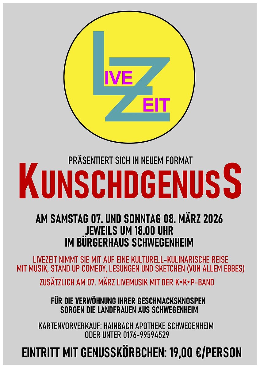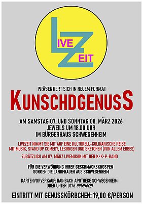 Die Theatergruppe LiveZeit veranstaltet am 07. und 08.03.2026 ein ganz anderes Programm namens KUNSCHDGENUSS. Hierbei handelt es sich nicht um ein Theaterstück, sondern um ein kurzweiliges Programm mit Musik, Stand Up Comedy, Lesungen, Sketche.